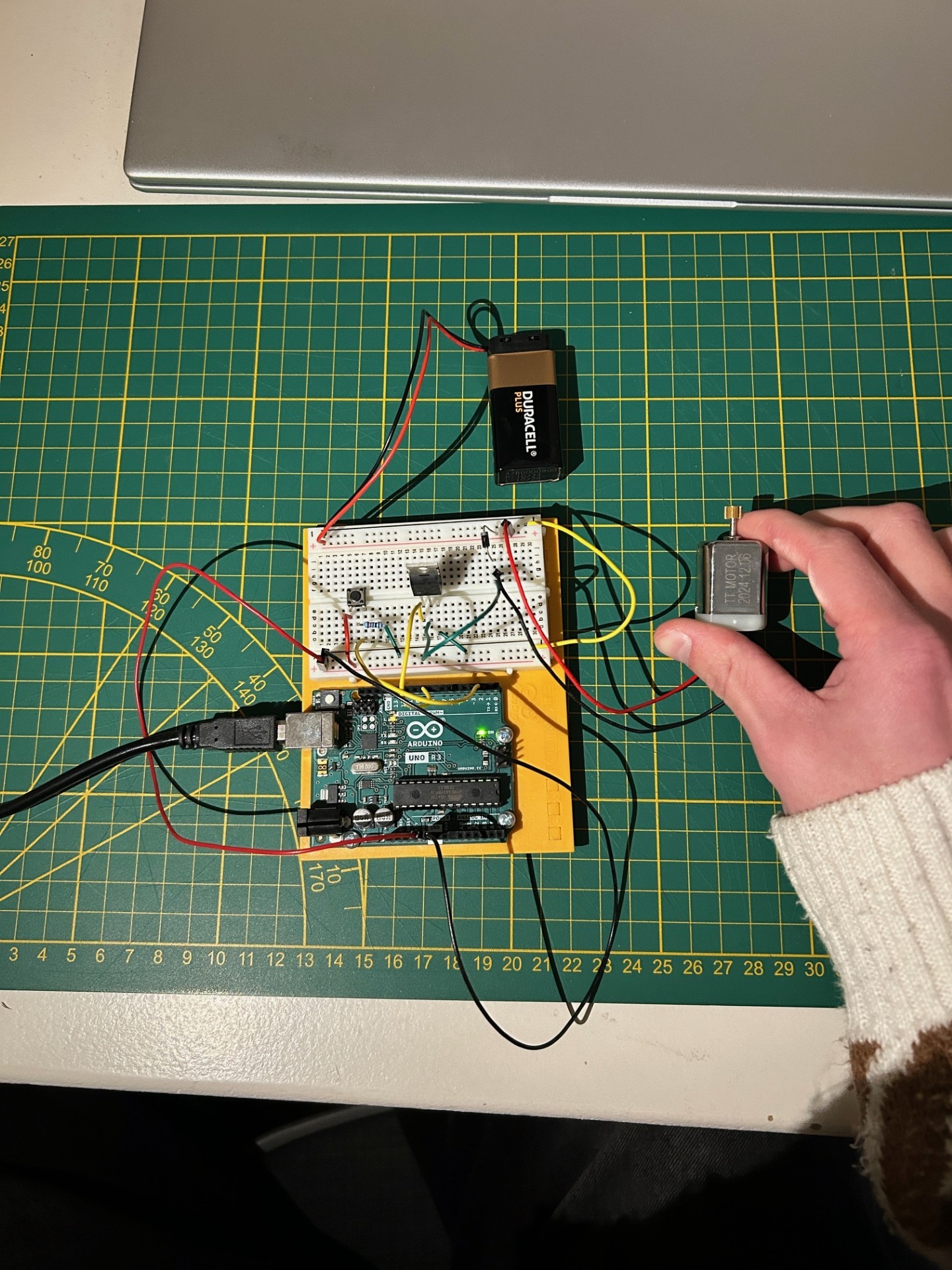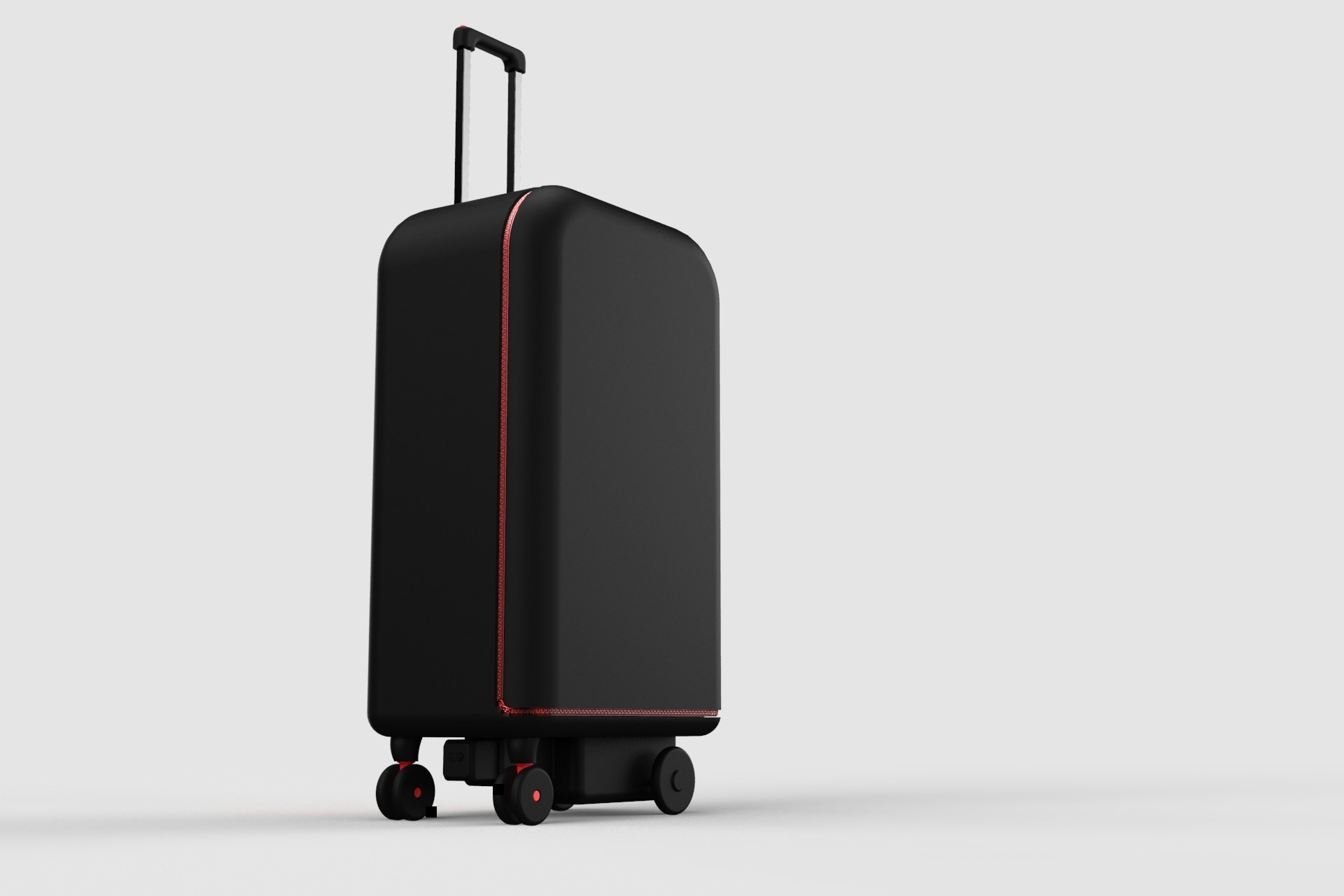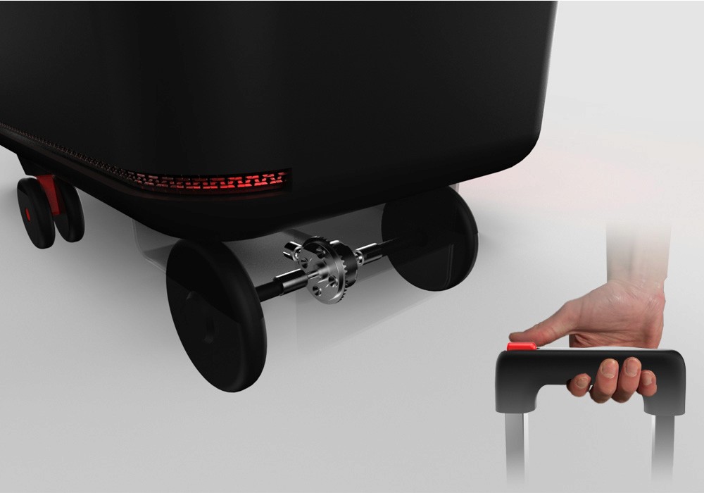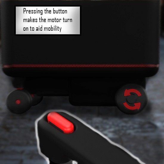 By pressing the button at the top of the handle the DC motor is turned on which turns the wheels via the differential but the suitcase can still be moved manually