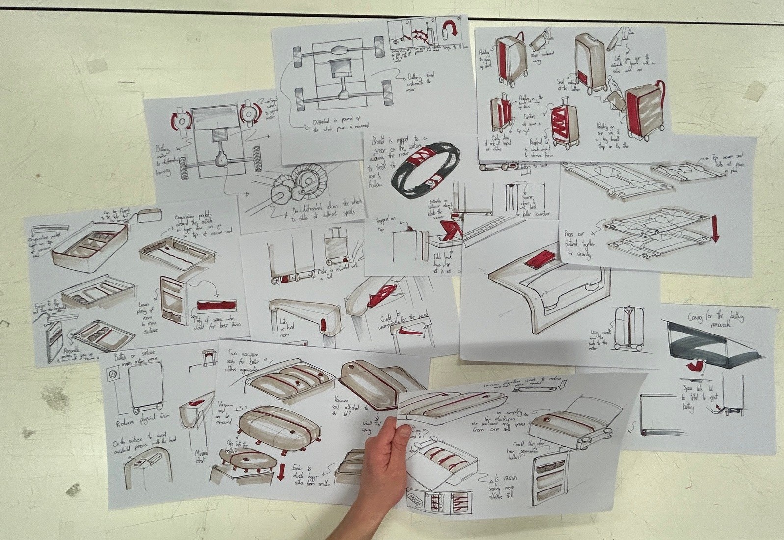 Prototypes were built from 3d prints, spare materials for quick prototypes and bread board testing. This allowed me to quickly understand how each component of my design would work and gave me better understanding of how someone would interact with this suitcase