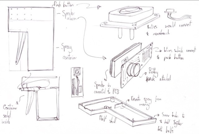 Models of foam where created to quickly understand dimensions and ergonomics. I understood how well TraceAlert would fit into somebody's hand and was able to base my measurements of it, which made way for 3D printed models to create and understand the interior. Electrical bread board wiring helped me to understand how to program the alarm system which would be placed inside as well. CAD modelling abled understanding of the spray mechanics letting me view how pieces would function.