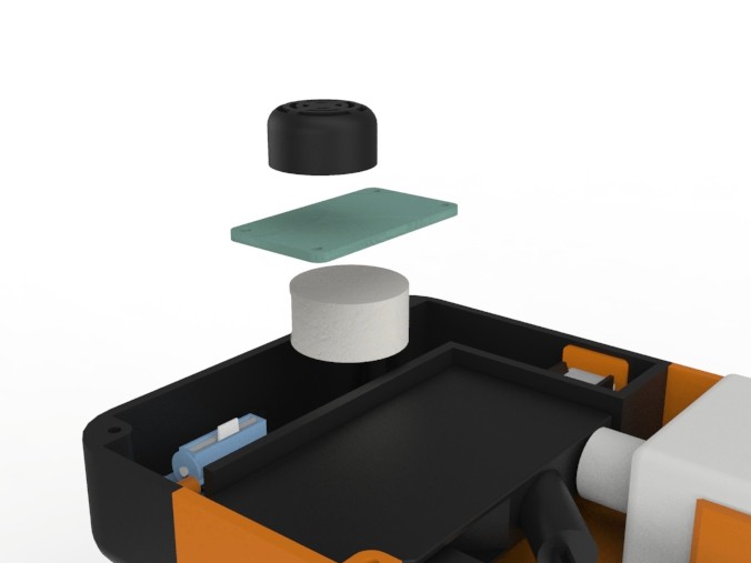 A PCB controls the alarm which is fitted into the top section of the casing. The piezo component is welded onto the PCB and the button cell is placed beneath it provide power to the alarm.